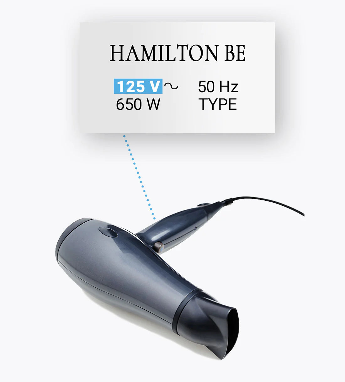 First, you'll need to make sure that your hair dryer or straightener is dual voltage - many are. Just check the label and look for INPUT AC 120V - 240V (or a variation of that) or a switch that can be set to 125V or 250V. If that’s there, then you’re set and can move on to step #2.